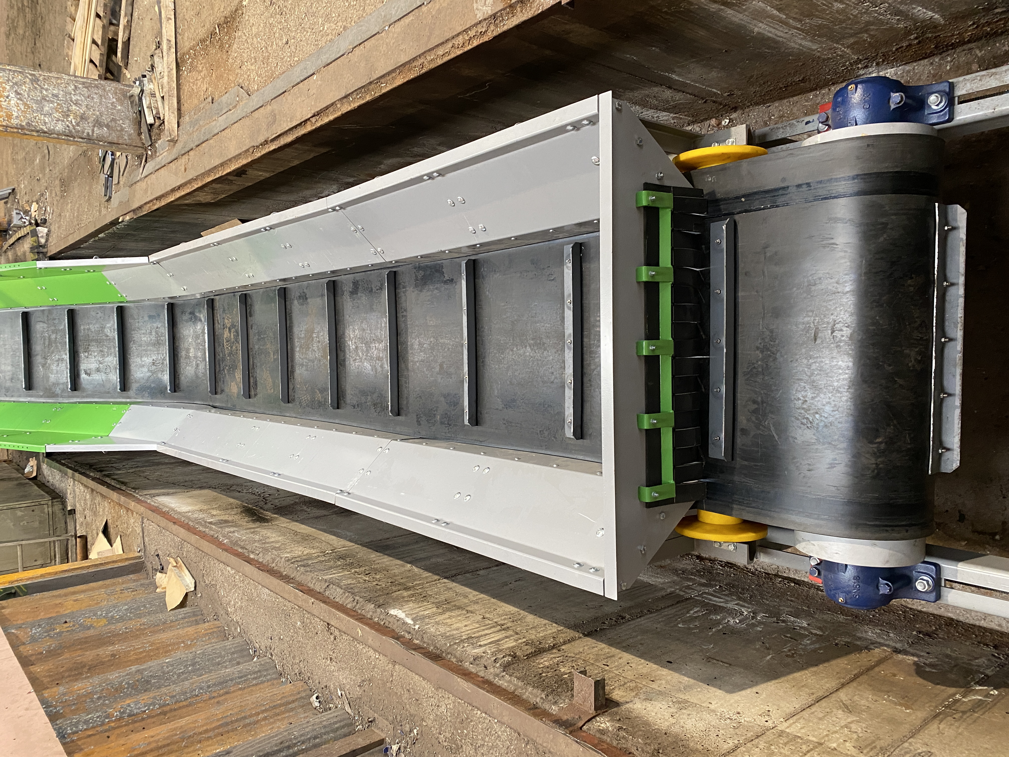 Pásový dopravník na prepravu elektrospotrebičov do drviča. GB 1000 AA 19 m